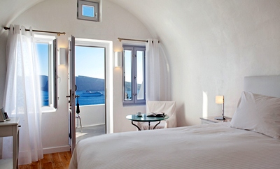 The Katikies Hotel pool takes your breath away, dripping over the cliffs, pulling you to it, its clean lines framing the incredible beauty. You feel as if you're floating in the sky. There is an additonal pool, shared by four of the units, allowing more than enough space for everyone to rest privately. The music is quiet and subtle, and even the guests seem quiet, because the design and placement of the hotel somehow controls unwanted noise. The rooms are their own private heaven too; the senior suites and honeymoon suite boast jacuzzis. The honeymoon suite provides magnificent views of the Caldera while your body is soaking in the suds. Senior Suites and Honeymoon Suites include champagne and an American breakfast. All rooms are decorated with authentic pieces of furniture and wall hangings from the island. The complex was renovated from a traditional house built into the cliffs. Featuring neo-classical design with tall ceilings, unlike the other cave dwellings, it allows you lots of space. Whether you are taking your afternoon siesta in the sun or in your room, you will be enveloped in complete serenity as you doze off. The service is always there for you but is so quiet that you sometimes wonder who takes care of the place. The Katikies has been featured in many travel magazines -- one of the reviews rated it as one of the top ten hotels by "Travel and Leisure", boasting the most beautiful pool with spectacular view.