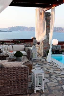 The house has a private courtyard with flowers, private infinity pool , fantastic sea views, a shaded lounge area under a pergola and sun beds. The lounge area is atmospheric especially in the night when it is candle lighted and you enjoy unlimited views from every corner of it. Stairs lead us to a large terrace on the upper floor that is equipped with a lounge area with views.On the back of the house there is a BBQ area, a wooden oven and a large wooden dining table overlooking the old Castle of Akrotiri.