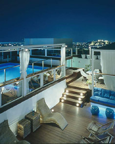 Located in the prestigious Kolonaki quarter of Athens, this older hotel is a favorite. Although the hotel is constantly being upgraded with modern technology, it still maintains a marvelous classic atmosphere, due largely to the wonderful, experienced staff. They are always smiling, and speak so many languages that you could never feel frustrated or lost. Although the roof-top pool is more for a quick dip than a swim, the panoramic view of Athens alone is worth the visit. Out your front door is the unbroken view of Athens and the hill of Lycabettus, which makes for a wonderful morning walk. Being located in the narrow windy streets of Kolonaki, free of bus traffic, is a tremendous advantage for those seeking a quiet hotel without masses of people. Another great selling point is the fashionable boutique shops just minutes away. The Acropolis View rooms are the hottest in demand.