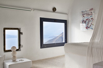 Nineteen large light apartments and Suites open on to sky-high views of the volcanic Caldera island and are painted in shades of blue, blue-grey and white. Materials are predominantly wood and stone, and colorful island textiles, used for rugs curtains and bed coverings, soften the look. Each apartment is different from its neighbor, and each is a showcase for the proprietor’s eclectic collection of antiques and found objects.