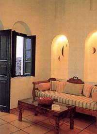 The name says it all, in the middle of the town of Fira, which is normally not a highly recommended spot, but with the right accommodation, all the negative comments soon fade away. Staying in Fira at any time besides July and August can have lots of advantages. This is true especially for young people searching for night life, as well as for those staying only a short time, wanting to get to know village life and its shopkeepers. The decor here is absolutely Greek, with wonderful fashionable art, ceramics and sculptures displayed throughout the complex. The rooms sport wonderful coverings , and even simple objects like bowls and vases are chosen with an artistic eye. The rooms have been renovated from cliff dwellings and each room has its own individual style, some having winding steps down to the large bathroom. Rest assured that these steps are worth it, because so many hotels in Greece have small bathrooms. The complex is very nice for singles wanting shared accommodation, as many rooms have extra loft beds. The service is wonderfully attentive and helpful. Please note 'restaurant' is a cafe-snack bar but is open continuously through out the day and night. This is very convenient and often gathers a crowd so it becomes a fun place to meet people.
