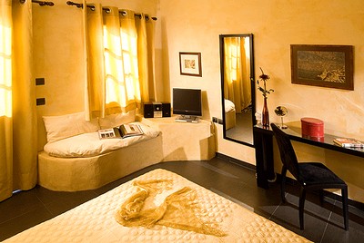 Honeymoon Suites are decorated in romantic fashion and are dressed with hardwood floors. They include a bedroom with a queen-size bed and a living room – one honeymoonsuite in an open-floor arrangement and the second one in a two-room arrangement – while their bathroom is equipped with a hydro-massage bathtub. Both honeymoon suites offer double occupancy,the other honeymoon suite may be re-arranged to accommodate a three-person family, with the third person sleeping in a sofa bed with a twin-sized mattress.