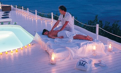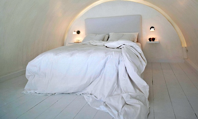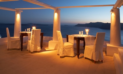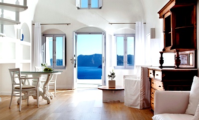 The Katikies Hotel pool takes your breath away, dripping over the cliffs, pulling you to it, its clean lines framing the incredible beauty. You feel as if you're floating in the sky. There is an additonal pool, shared by four of the units, allowing more than enough space for everyone to rest privately. The music is quiet and subtle, and even the guests seem quiet, because the design and placement of the hotel somehow controls unwanted noise. The rooms are their own private heaven too; the senior suites and honeymoon suite boast jacuzzis. The honeymoon suite provides magnificent views of the Caldera while your body is soaking in the suds. Senior Suites and Honeymoon Suites include champagne and an American breakfast. All rooms are decorated with authentic pieces of furniture and wall hangings from the island. The complex was renovated from a traditional house built into the cliffs. Featuring neo-classical design with tall ceilings, unlike the other cave dwellings, it allows you lots of space. Whether you are taking your afternoon siesta in the sun or in your room, you will be enveloped in complete serenity as you doze off. The service is always there for you but is so quiet that you sometimes wonder who takes care of the place. The Katikies has been featured in many travel magazines -- one of the reviews rated it as one of the top ten hotels by "Travel and Leisure", boasting the most beautiful pool with spectacular view.