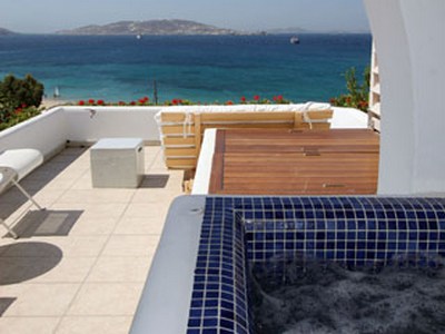 The Superior Suites offer spacious furnished terraces with a temperature controlled plunge pool and comfortable bedrooms with a king-size bed and separate sitting area plus a large modern bathroom. The view from the terraces is westwards towards the island of Delos and the port of Mykonos.