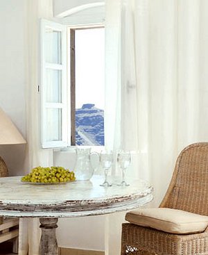 Airy spaces shaped into the rocks, filled with luscious amenities such as soft cottons, down feather fillings, fluffy bathrobes and fun toiletries. Balconies and verandas with superb views to the sea filling the Caldera. A beautiful scenery, to be viewed only by the guests of San Antonio. As the architecture, shapes and materials are attached to the earth; primitive and natural yet glamorous. White and light colors blend with the gardens subtly reflected on the soft fabrics.