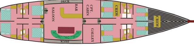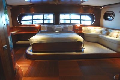2 Cabins with twin bed ( aft cabin 140 x 220 cm, 90 x 220 cm respectively; forward cabin 90 x 220 cm x 2 beds), desk, wardrobes, mini-bar, shower/washroom & WC.
