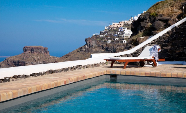 This rare house, literally carved into the cliffs features large terraces and a very nice private pool to offer these stunning views. As like any hotel or Villa built on the caldera the beaches are on the flat side of Island about 20 mins away.