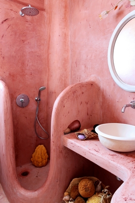 On this floor you can find the Lady’s bedroom. It has a romantic wooden double bed, with the famous painting of the red bicycle hanged above it, a vanity dressing area that can hold all the clothes of a lady and a big handcrafted mirror. The bedroom is served from a red bathroom with shower.
