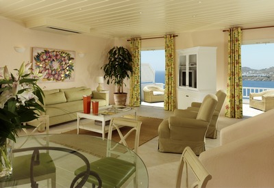 This hotel certainly has the best spot on the island. It is on the edge of a private peninsula of Ornos bay. A private road brings you into this very elegant complex of both private villas and a hotel. All the rooms in the complex are very spacious with large terraces and fantastic sea views. Having been built in stages the décor is different in every room, but soft pastels feature throughout, which looks so good against the white cubic walls. The rooms in the newest sections are in the highest building of the complex so the views are great. Some of the villas are for rent, with private pools, beautiful decoration and the highest quality of furnishings. The large pool, private beach, health spa and tennis court, all in easy reach, will certainly demand your attention.