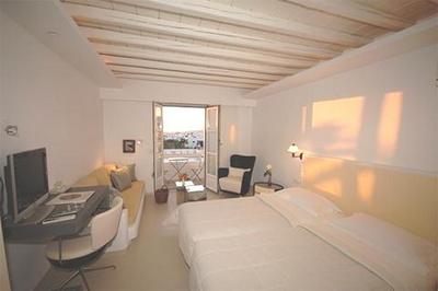 Every part of this beautiful hotel is like a perfectly decorated home, perhaps because it was indeed a family residence many years ago. You will be quickly drawn to the pool terrace where the only reminders of Mykonos (although you are right at the edge of he town), besides the view, are the muted sounds from the nearby schoolyard. The rooms are decorated in soft yellows and rich greens and have everything necessary to truly enjoy the rooms, balcony and lovely atmosphere.
