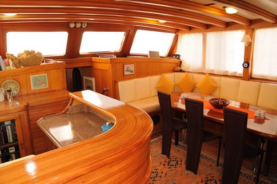 The dining area in the main salon has large windows to afford wide all-round view. The broad aft deck with its full wooden dining table and cushioned seatings (teak chairs) is a natural extension to the saloon and a perfect alternative venue for meals, coctails and sunbathing. International cuisine, with the emphasis on Turkish dishes, is prepared deliciously in the well equipped modern galley.