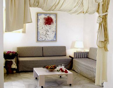 The lush tropical gardens here are in stark contrast to the arid terrain one normally finds on the Cyladic islands. One of the few hotels where grass grows straight on to the seaside, this is a place where the view of the garden is as wonderful as the sea. The lavish pool and tennis courts remind you that besides all the sights on the island there are some wonderful things to enjoy at the hotel. The rooms are modern and light, and the outside dining area is very enjoyable in the evenings, especially the romantic bar area.