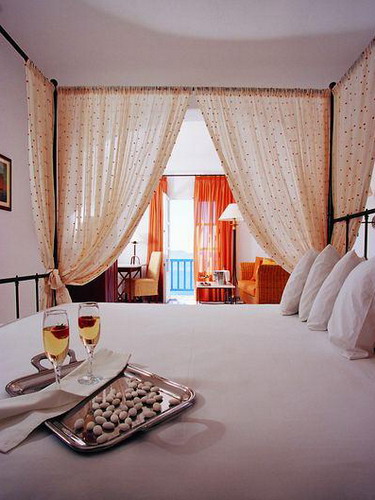 Standard Sea View Rooms: Spacious rooms with sea views on the west part of Mykonos (sunset), all floors are made with the finest quality of Greek marble and the typical Mykonian arch defining the bedroom from the sitting area.