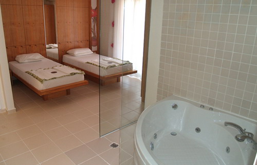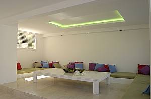 Modern with minimalist style but lacking no comforts in rooms or lounge or pool area. Hiding around the pool you will find larger sitting rooms filled with books and magazines and as you relax on the large cushions in these rooms, prisms of colors sparkle around the jeweled strings of glass that separate the room from the pool.