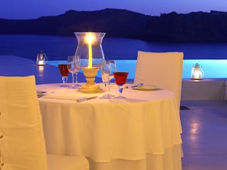 THE BASILICO GOURMET RESTAURANT : At this small " A la Carte " Gourmet restaurant you may have a romantic candlelight dinner at an open-air veranda with spectacular views, and taste our chef's culinary proposals, based on the seasonal products of the sea and land of Santorini.