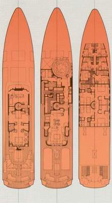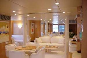 Guests are accommodated in five additional staterooms (two doubles and three twins), which are well appointed with television, VCR and music system. A spiral staircase opens to a pool and lounge area on the boat deck, complete with its own wetbar. Several lounges provide charterers with different outlooks; one for observation, one for television and one for enjoying balmy sea breezes.