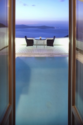 Each suite occupies an area of approximately 100 sq m with spacious terraces and large private pools. The interior consists of large living room area equipped with B/O sound and visual system, dinning area all complimented with numerous large windows offering breathtaking views of the Aegean, Volcanic islands and during the afternoon the sunset which sets in front of the suites.