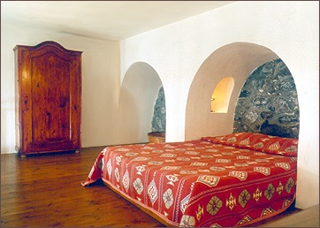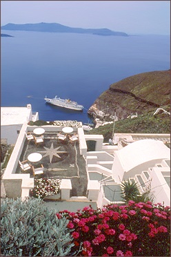 The name says it all, in the middle of the town of Fira, which is normally not a highly recommended spot, but with the right accommodation, all the negative comments soon fade away. Staying in Fira at any time besides July and August can have lots of advantages. This is true especially for young people searching for night life, as well as for those staying only a short time, wanting to get to know village life and its shopkeepers. The decor here is absolutely Greek, with wonderful fashionable art, ceramics and sculptures displayed throughout the complex. The rooms sport wonderful coverings , and even simple objects like bowls and vases are chosen with an artistic eye. The rooms have been renovated from cliff dwellings and each room has its own individual style, some having winding steps down to the large bathroom. Rest assured that these steps are worth it, because so many hotels in Greece have small bathrooms. The complex is very nice for singles wanting shared accommodation, as many rooms have extra loft beds. The service is wonderfully attentive and helpful. Please note 'restaurant' is a cafe-snack bar but is open continuously through out the day and night. This is very convenient and often gathers a crowd so it becomes a fun place to meet people.