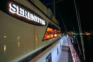 As you walk down the central staircase to the lower deck, the galley appears on the port side. The flooring of the galley has been kept low in order to provide extra storage space and allow for the large Amana fridge. On the starboard side are two twin cabins. There are two master cabins with queen size beds, one of them located on the port side and the other in the forward. All rooms are en-suite and have full air-conditioning, smoke detectors, HD televisions, DVD players, CD players, Satellite TV, desks with make-up mirrors, reading lights, and iPOD connection centers. Main lighting throughout Serenity 86, including all the lighting in all the rooms makes use of spot lights located on the roof.