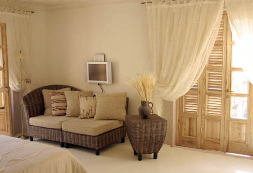Its interior decor is a subtle blend of beige tones, highlighted by carefully choosen exotic wooden furnitures. Its refined decoration confers a feeling of well-being and comfort. All rooms are opening to an olive tree shaded garden and the swimming pool which has wooden decking around. In addition to this, rooms at the second floor have seaview.