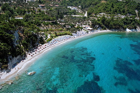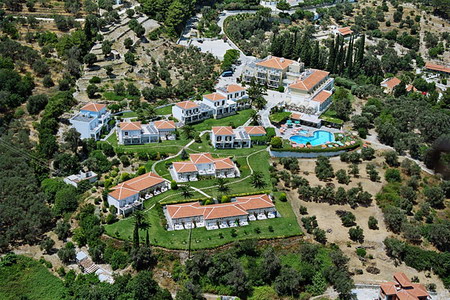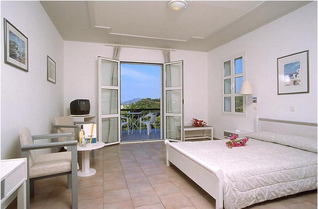 The hotel consists of 108 rooms, divided between the main building and a bungalow complex. Their large verandas overlook the deep blue Aegean Sea and the lush green surroundings.