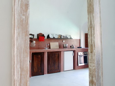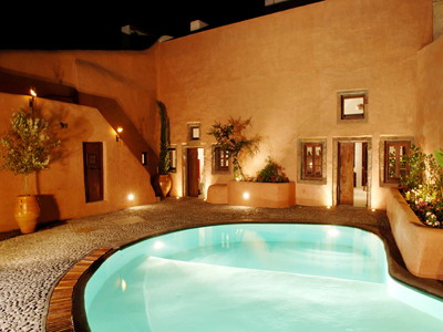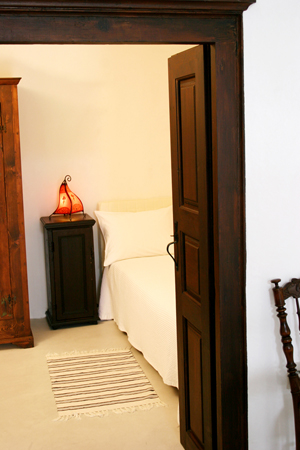 The layout of the house takes the form of the old traditional Santorini houses. The farm-style kitchen is large and well equipped with a dinning area. Double wooden doors open up into a single room and a staircase leads you up to a delightful den, which can accomodate two people. Through an arched passageway you will find the living room with doors leading out to the courtyard and pool. Double doors lead from the lounge to a comfortable double bedroom. The open-space bathroom has a Jacuzzi and shower with a separate restroom.