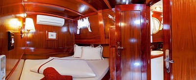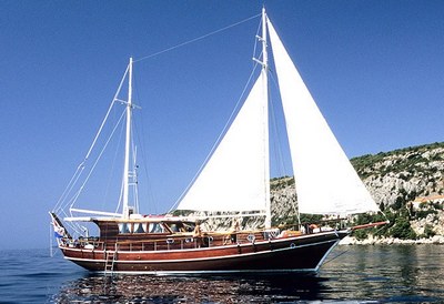 Main sail, Genoa, Electric anchor winch, Passenger loading stairs, Dinghy with outboard engine, Sun awning, Shower on deck, Teakwood deck, Large table on round stern, Barbecue