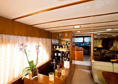 The spacious salon on the main deck, furnished with leather settees and polished cherry-wood paneling mini bar facilities, air-conditioning plus audio and video entertainments systems, offers the ultimate in shipboard relaxation. It can be separated from the rest deck (fully equipped kitchen and cockpit) to ensure your privacy.