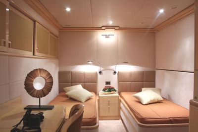 Five Staterooms for a total of 11 guests. The Owner˘s stateroom is forward, and has the full width of the ship Very large matrimonial bed 1,90m x 2,10m Most comfortable, well appointed sitting room en suite The private facilities include a bathtub with Jacuzzi independent from the wash basin/dressing space and separate from the head There is an independent office/study, en suite, with desk and cabinet for storage space with PC and plugged-in Internet satellite communication Four Guests˘ Staterooms One with large matrimonial bed 1,70m x 2,10m, private facilities including shower room and separate Jacuzzi One with large matrimonial bed 1,65m x2,10m, private facilities including shower One with twin beds and an additional Pullman berth, with private facilities including bathtub One with twin beds and private facilities including a shower room Note also that upper deck salon can be transformed upon request to an additional (6th) stateroom (as both sofas can be converted to beds)with twin beds and ensuite facilities.