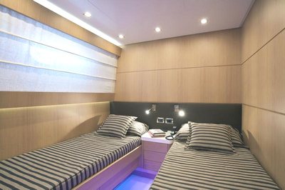 The Master Cabin has a very comfortable double bed in the center of the cabin, a walk-in-dressing to the right and the en-suite facilities to the left. Spot lights are situated on both sides of the bed along with two drawer night tables at each side. A vanity is also situated at the left hand side, directly in front of the window. The en-suite facilities have two WC of stunning black marble and shower. Satellite TV, DVD, CD and hi-fi audio are just a touch upon your request, air-conditioning and small safe.
