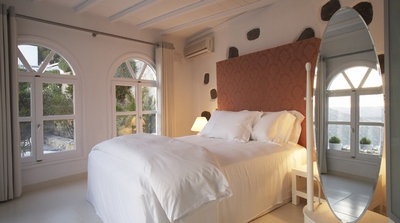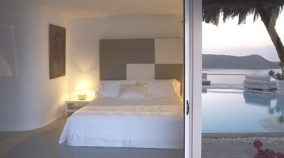 Classic Mykonian styling El Greco Suite and a light breezy atmosphere belie the modern luxuries within. Living area with built-in daybed and shelving looks out upon Cavo Elia from shuttered windows. Sparkling white plaster walls lead to the full bath, with a tub gazing out upon the sea. The bedroom features a glorious low profile queen bed with lighted headboard. For the romantic, a large fireplace and built-in shelves compliment the framed stone flooring. Generous closet space and shelves throughout complete this apartment's interior. Stone archways frame a peaceful and private sheltered garden and enormous private balcony. A second balcony with daybed provides a cozy area for a single traveler or couple to enjoy breakfast or a glass of wine. This apartment is an excellent choice for an extended stay.