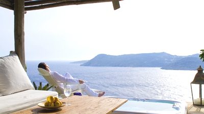 One of pool side villas, Vincent suites offers effortless access to all of Greco Philias amenities. A wall of sliding glass doors opens to the pool and bar area. The spacious bedroom is decorated in a minimalistic fasion, and adorned with glittering white walls. A full marble bath is accessed through the gorgeous modern tempered glass door, the styling of which is repeated in the shower gliders. A marble vanity and plentiful storage happily accommodate even the most serious preening. Passing another tempered glass divider, the guest finds themselves in a palatial eat in kitchen, featuring handcrafted kitchen cabinetry, a marble breakfast bar, travertine tile flooring, recessed lighting and a large area for dining or lounging surrounded by stately daybeds and storage.