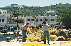 The boats land their passengers at Skala (the harbor), in a bay on the east side of the island. In the old days there was little more than a collection of vaulted warehouses (now converted into cafes and shops) around the port of Patmos as workers and merchants retreated to the safety of the upper town. Nowadays Skala is a pleasant port with simple white houses and the principal town of the island is always bustling with activity. Along the quay, the Venetian arcaded building with a corner tower houses the harbor master's office, the customs, the police, an information office and the post office. Nearby are the taxi and bus stations and the local boats which offer excursions to the beaches on Patmos and neighboring islets and to Leros, Kalymnos and Kos. The nearest beach is at the northern end of the port, near a red buoy marking a submerged rock; it is said to be the magus Kynops who defied St. John and dived to the bottom of the sea and was turned to stone.
