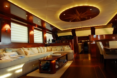 Salon with extensive sofa seating, coffee table, dining table with banquette seating and 4 dining chairs, TV and entertainment systems, helm and navigation panel, bar-service area.