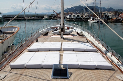 Great attention has been given also to the external furnishing, where both on fore and aft spacious pillows allow the guest to get pleasure from the navigation: 12 sunbeds cuddle the guests, while a wide dining table with its welcoming seating creates the perfect atmosphere for unforgettable moments of relax protected from the sun.
