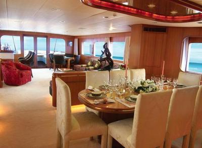 111' (34m) Motor Vessel; Fully Air conditioned; 8 to 10 Guests in 4 to 5 beautifully appointed cabins. Master Suite with his and her bathrooms; A deck level Master with Shower, one VIP double with ensuite; and a Twin cabin interleading into a childrens cabin (sharing one bathroom). A Deluxe vessel.