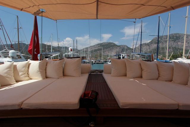 Aft Deck with extensive cushioned reclining space, dining table and cushioned banquette seating plus 4 wicker chairs, large bar/service area, helm and control panel, Fore deck with sun-cushions and stern facing seating with low table, crane and watersports equipment.