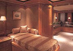 This beautiful state of the art semidisplacement Megayacht is considered the flagship of the Greek charter fleet. Launched in 1997 by Intermarine Spa, Italy, she is well built, appropriatly planned, designed with sobriety and classical elegance featuring unusually large spaces. Giorgio Vafiadis is responsible for the design of this truly remarkable yacht. Her luxurious interior is adorned with mahogany panelling, hand made fabrics and custom made carpeting. O’PARI meets and exceeds international standards. This charter yacht will satisfy the most demanding client. O’PARI is unique. For twelve guests in six luxurious staterooms. One master suite with jacuzzi tub and shower room in the bathroom on the upper deck. One VIP suite with study on the centre deck forward, also with jacuzzi tub in the bathroom. On the lower deck; two double staterooms with jacuzzi tubs in the bathrooms and two twin staterooms, with shower rooms in the bathrooms. These two twins are separated by a sliding partition that allows them to combine into one large stateroom. All staterooms have walk-in closets.