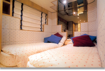 One master cabin with en suite facilities, One V.I.P. cabin with en suite facilities,One double cabin with en suite facilities,One twin cabin with an additional pullman berth and en suite facilities . Crew of four in separate quarters .