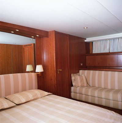 GINA M is amongst the most luxurious charter yachts in the Mediterranean, designed by Fulvio de Simoni. Its unique design, shape and decor, together with her ability to cruise in total comfort, places GINA M, on top of the list. Well built, appropriately planned, designed with classical elegance, featuring large spaces, she can accomodate comfortably 8 guests with an expert crew fo 4 to cater to their needs. Satine wood panelling, builit-in furniture, custom made carpets, fine handmade fabrics, together with superb service and taste, will lead your cruise in perfection. Four luxury cabins, two doubles and two twins, all with en suite bathrooms and specially desinged for comfort and sweet dreams. Sun drenched and sun shaded areas offer various possibilities for dining and leisure.