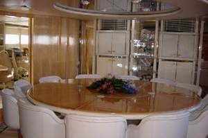 Guests are accommodated in five additional staterooms (two doubles and three twins), which are well appointed with television, VCR and music system. A spiral staircase opens to a pool and lounge area on the boat deck, complete with its own wetbar. Several lounges provide charterers with different outlooks; one for observation, one for television and one for enjoying balmy sea breezes.