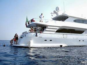 The salon and the spacious cockpit are the best living zone of this yacht. The salon has a dining table for 8, leather sofa, bar with ice maker, TV 32 inc, hi-fi stereo with CD (very high quality system), piano. The excellent quality audio system is indipendent in each room and in each suite (individually controlled). The separate galley is fitted with: dishwasher, 2 freezers, 2 ovens, 2 refrigerators. On the main deck is the Owner's suite with ample windows on the sea (which can be opened and closed with electric control), king size berth, flat screen TV, hi-fi system, en-suite bathroom with separate Jacuzzi shower box (can also be converted in saune). The VIP suite is on lower deck and has queen size berth, flat screen TV, hi-fi system, coiffeuse, private bathroom. Then, always on lower deck, there's another double bedded suite, always with his own bathroom (with Jacuzzi shower box for 2), flat screen TV, hi-fi, coiffeuse, dressing room. Then there are 2 twin cabins with separate berths and private bathroom (with Jacuzzi) each. All cabins have flat screen TV, hi-fi system and all bathrooms have marble finishing, teak floor, Jacuzzi shower box. The Captain's cabin is next to the wheel house with private bathroom while the crew quarter is forward on main deck with private access and facilities.