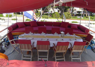 Large teak table on stern with teak chairs